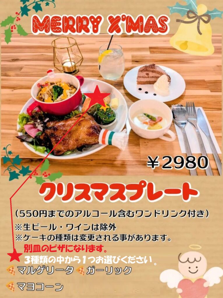 12/24(水)は19時まで営業(ラストオーダー18時)。12/25日は通常営業(15時まで)です。