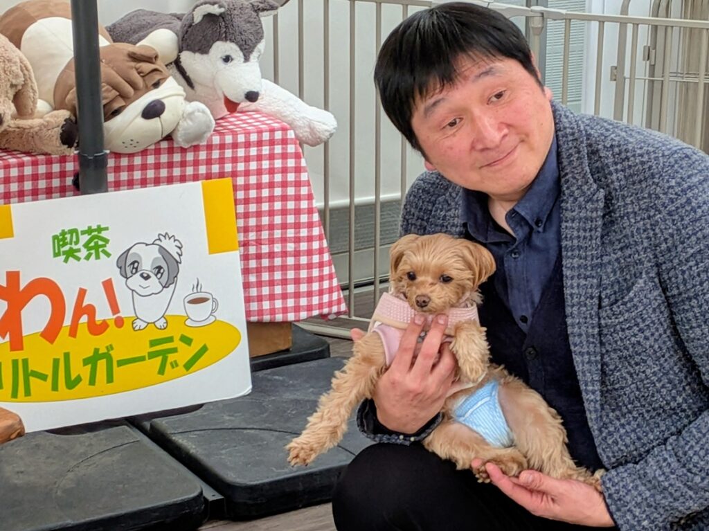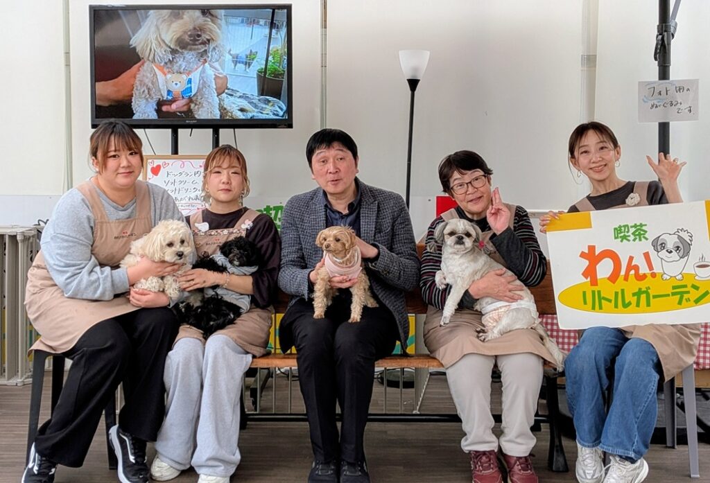 左からスタッフ、スタッフとのんちゃん・にこちゃん、ほいけんたさんとはなちゃん、オーナーとてんちゃん、スタッフ。